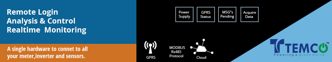 Temco base Unit which will be fixed to the solar/Wind system , it is designed to take data using RS485 MODBUS protocol. Once all the data is read from the Energy meter/Inventer it uses moblie GPRS connection to send data to our server (A SIM card any Network needs to be inserted into our unit).